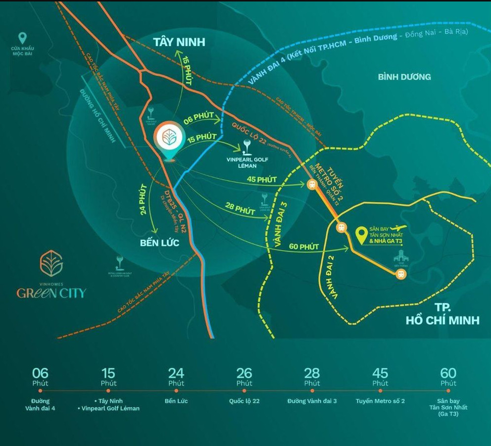 Trong bức tranh đó, Vinhomes Green City nổi lên như một hình mẫu cho mô hình đô thị vệ tinh thế hệ mới. Dự án có quy mô 197,2ha, tọa lạc tại vị trí chiến lược nơi cửa ngõ Tây Bắc TP.HCM, nằm trên hành lang kết nối liên vùng với Long An, Tây Ninh, đồng thời kết nối nhanh về trung tâm qua Vành đai 3, 4, cao tốc Gia Nghĩa – Chơn Thành và Metro số 2…